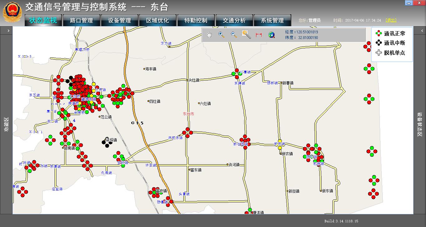 基于GIS地圖形式的信號控制系統中心綜合信息(路網交通流、設備運行狀態及基礎狀態)顯示: